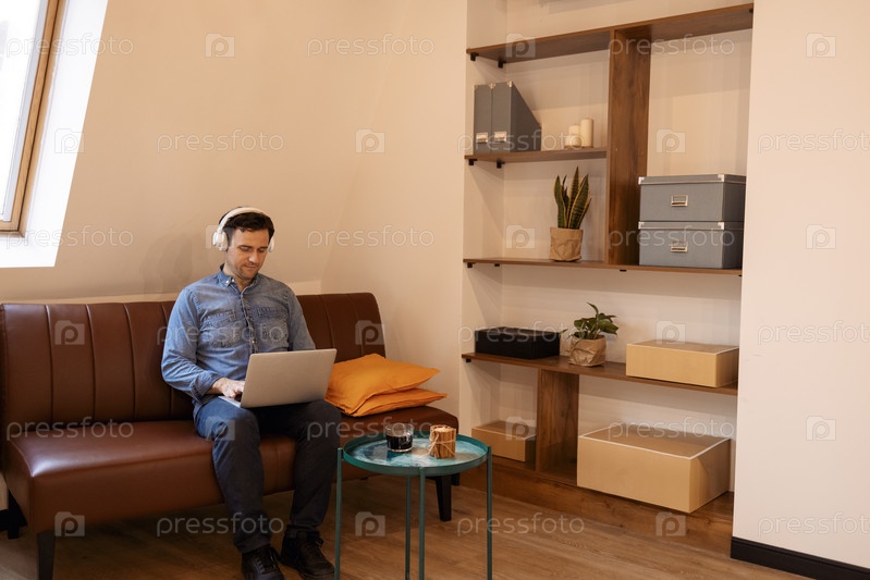 Улыбающийся взрослый мужчина в наушниках, смотрящий в камеру, цифровой видеозвонок на ноутбуке