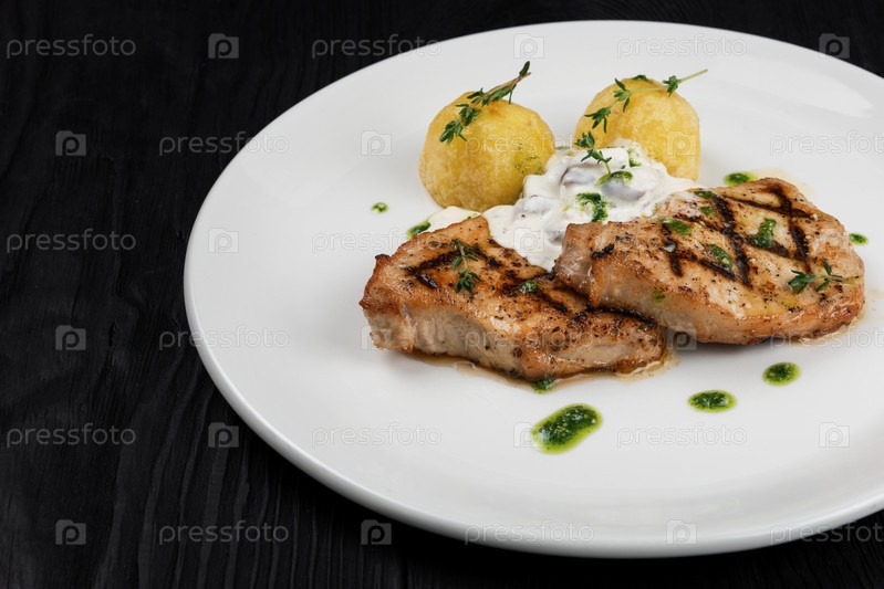 Жареная свинина с грибным соусом и картофелем на белой тарелке на деревянном черном фоне