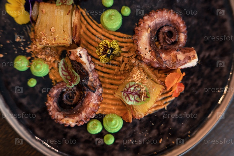 Осьминог с картофелем на гороховом пюре