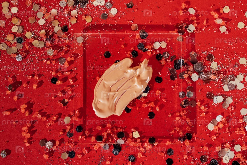 Косметический мазок тонального крема на прозрачном стекле. Яркий красный фон