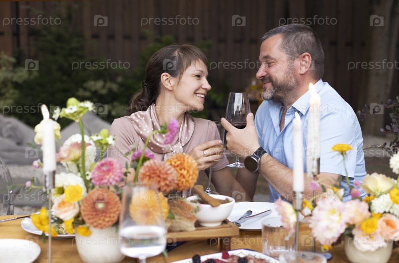 Счастливая пара разговаривает и флиртует в саду на террасе, держа бокалы с вином