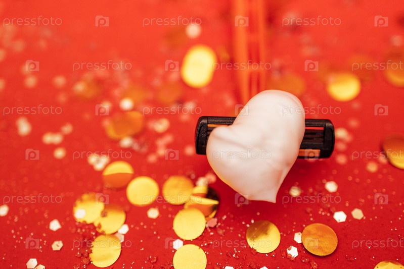 Бритва с пеной для бритья в форме сердца. Ярко-красный фон с серебряными блестками и золотыми круглыми конфетти