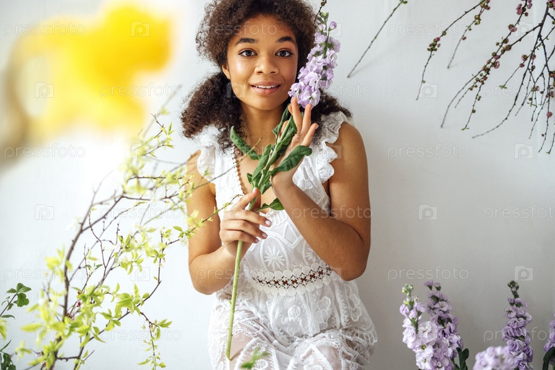Красивая улыбающаяся афроамериканка в белом кружевном платье держит в руке цветок