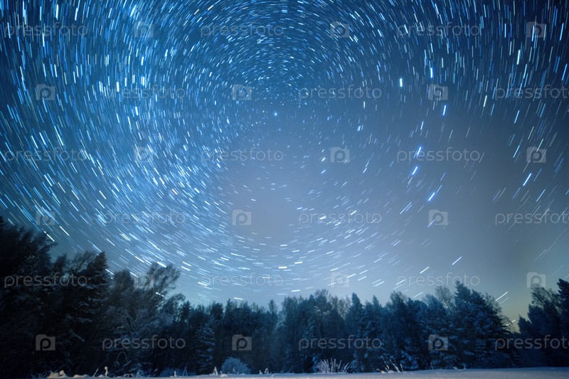 Звездное небо вращается вокруг полярной звезды. Оставляйте следы в виде линий. Зима, Россия