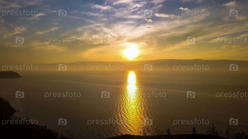 Россия, Озеро Байкал, Остров Ольхон, Закат над бухтой Малого моря, С дрона