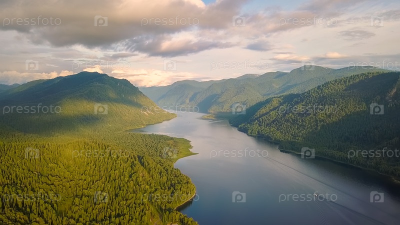 Панорамный вид на Телецкое озеро, Подъем к облакам. Россия, Алтай. Горы, покрытые лесами, От дрона