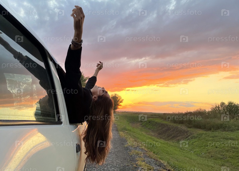 Молодая женщина в солнечных очках выглядывает из окна белой машины. Симпатичная брюнетка раскрыла руки к небу