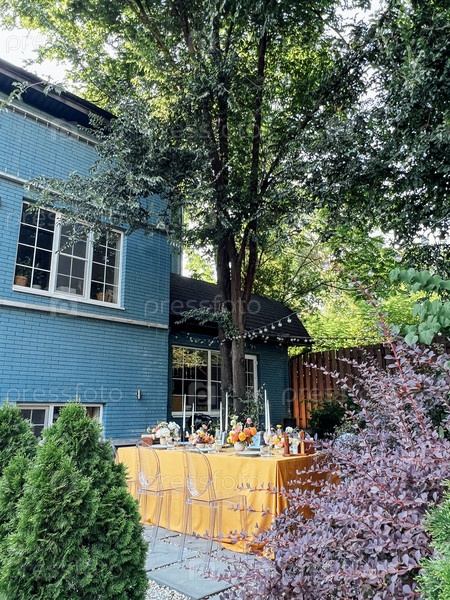 Свадьба. Банкет. Стулья и стол для гостей, украшенный свечами,
