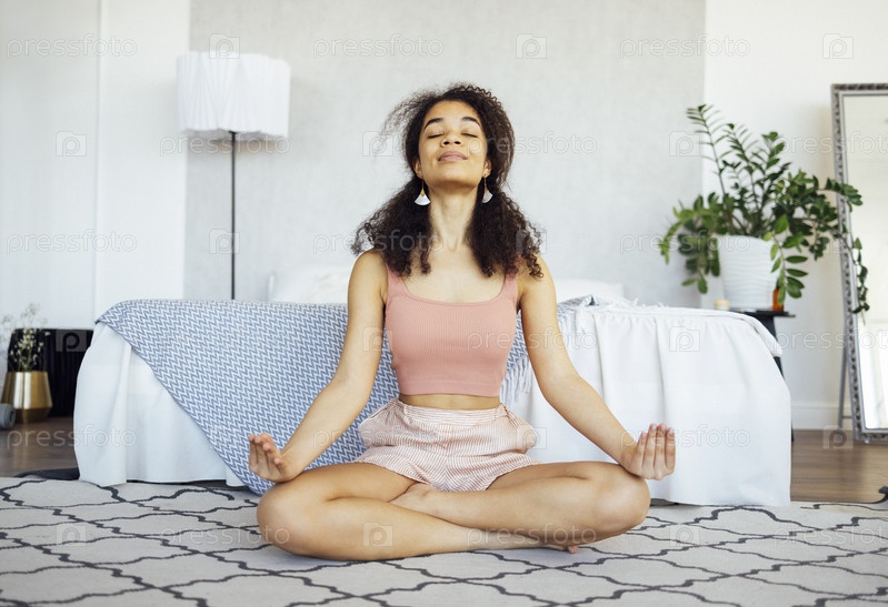 Медитация и расслабление. Черная девушка занимается утренней йогой, сидя в позе лотоса