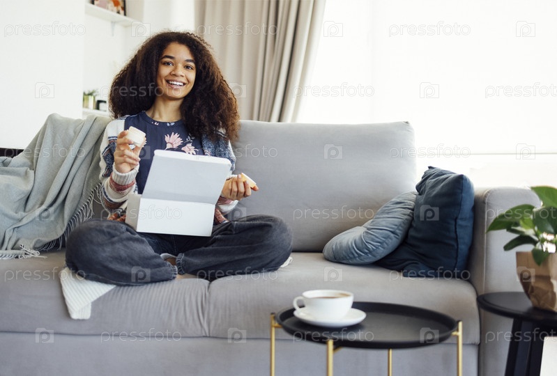 Портрет улыбающейся афроамериканки получил посылку, распаковав картонную коробку с косметикой