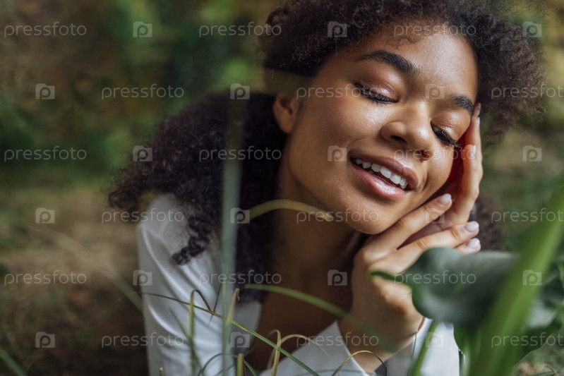 Крупным планом портрет довольно молодой афро-американской женщины, лежащей на траве. Красивая афро девушка отдыхает в парке