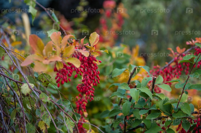 Красочные яркие ветви барбариса с красными ягодами осенью