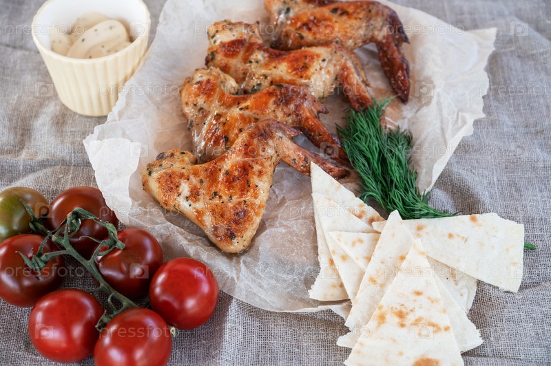 Готовые острые куриные крылышки на гриле с зеленью и помидорами