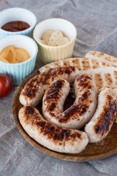 Жареные колбаски с соусом и овощами. Концепция летнего отдыха