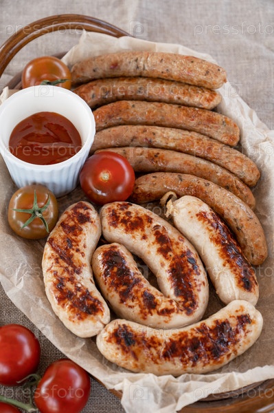 Жареные колбаски с соусом и овощами. Концепция летнего отдыха
