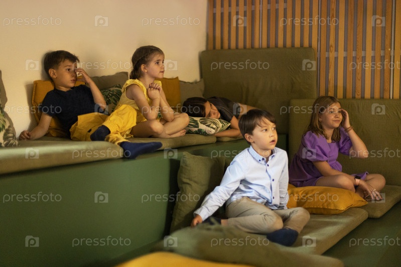 Маленькие мальчики и девочки выглядят шокированными и удивленными, смотря фильм в домашнем кинотеатре