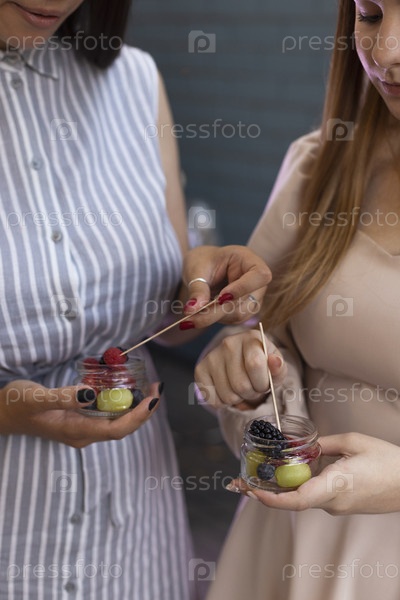 Стеклянная банка с салатом из фруктов и ягод в руках подруги