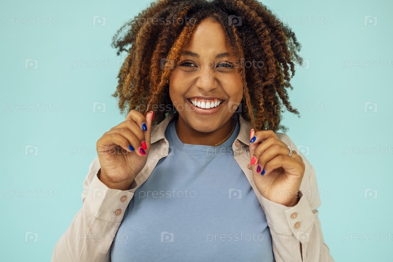 Позитивная афроамериканская модель трогает чистые вьющиеся волосы после гигиенической обработки