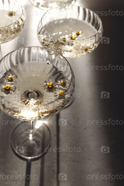 Игристое вино с цветами ромашки. Вид сверху