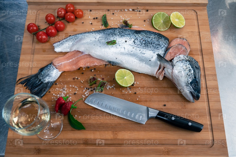 Свежий сырой лосось на деревянной доске кухни со специями и лаймом