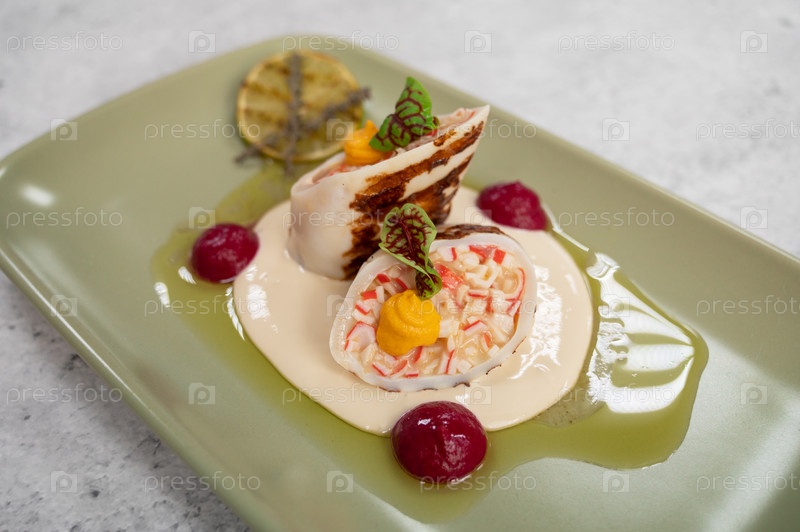 Кальмары, фаршированные крабовым мясом и сыром крупным планом