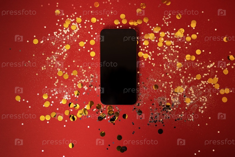 Новый мобильный телефон лежит на красном фоне среди серебряных блесток и круглых золотых конфетти. Телефон с пустым экраном
