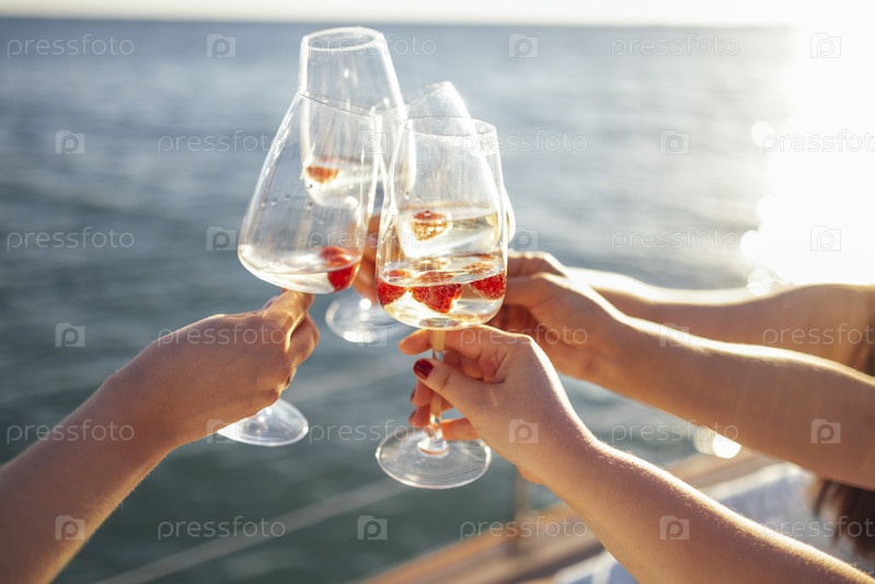 Закатное небо и море на заднем плане. Праздничный тост с игристым вином