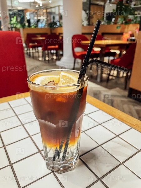 Вкусный холодный кофейный напиток. Свежий коктейль со льдом, ломтиками лимона и соломкой. Холодный капучино на белом клетчатом столе