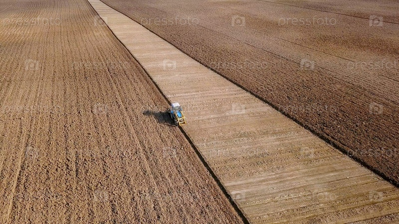 Трактор вспахивает поле с удобрениями. Осень, Россия