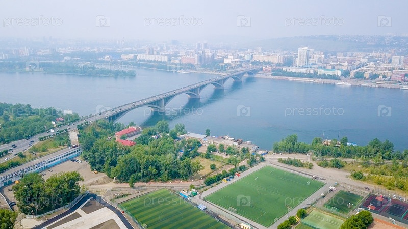 Вид на Коммунальный мост через реку Енисей. Центр города Красноярска. Россия, Из Дрона