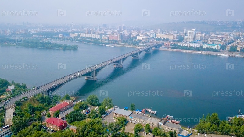 Вид на Коммунальный мост через реку Енисей. Центр города Красноярска. Россия, Из Дрона