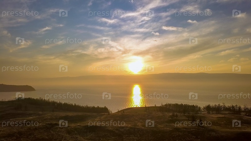 Россия, Озеро Байкал, Остров Ольхон, Закат над бухтой Малого моря, С дрона