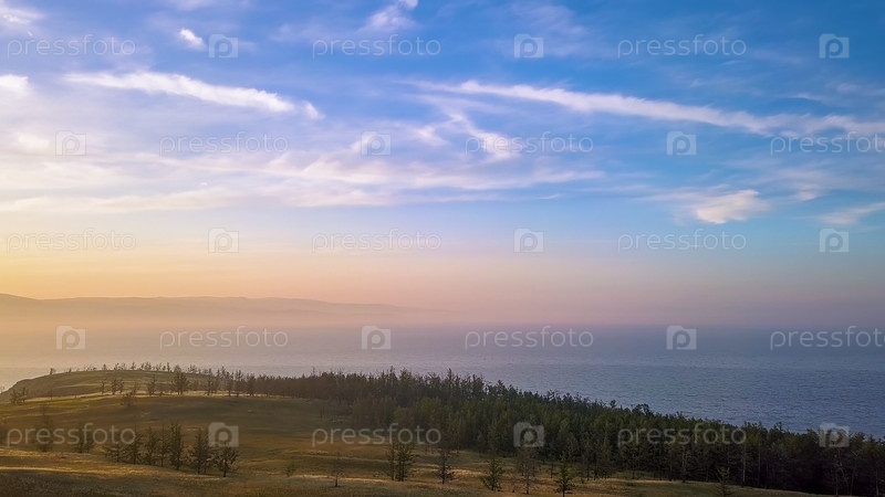 Россия, Озеро Байкал, Остров Ольхон, Закат над бухтой Малого моря, С дрона