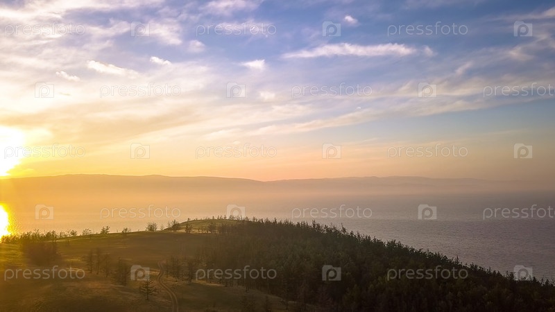 Россия, Озеро Байкал, Остров Ольхон, Закат над бухтой Малого моря, С дрона