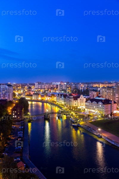 Ночной вид на центр Калининграда. Юбилейный мост, Рыбная деревня, Каналы реки Преголя. Россия