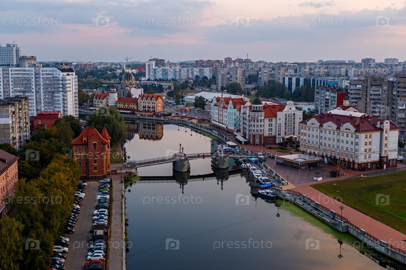 Утро в Калининграде. Река Преголя, набережная Рыбной деревни и Юбилейный мост. Россия, Калининград