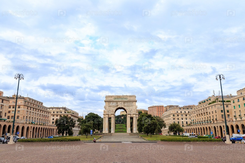 В Италии, Генуя. Арка Победы. Текст на английском языке: ГЕНУЯ. СИНОВИЯ, ПРОБЛЕЖНОСТЬ РОДОНЫ, ЗАГРАЗОВАТЕЛЬСТВА НА ЛЕСЕ И МОРЕ В ЦЕРКУ В Славе Веков. СПОРТА ОПИСАННАЯ. MCMXV-MCMXVIII