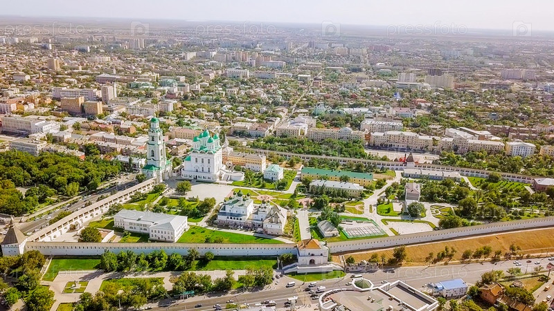 Вид с воздуха на Астраханский Кремль, историко-архитектурный комплекс. Россия, Астрахань