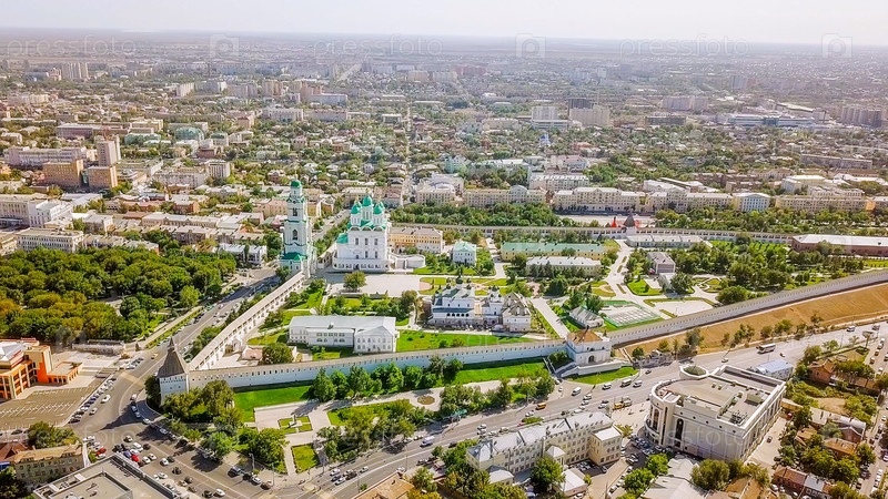 Вид с воздуха на Астраханский Кремль, историко-архитектурный комплекс. Россия, Астрахань