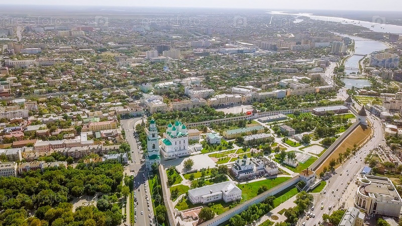 Вид с воздуха на Астраханский Кремль, историко-архитектурный комплекс. Россия, Астрахань