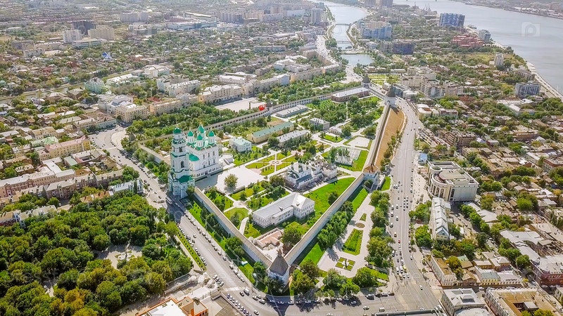 Вид с воздуха на Астраханский Кремль, историко-архитектурный комплекс. Россия, Астрахань