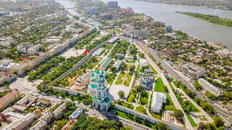 Вид с воздуха на Астраханский Кремль, историко-архитектурный комплекс. Россия, Астрахань