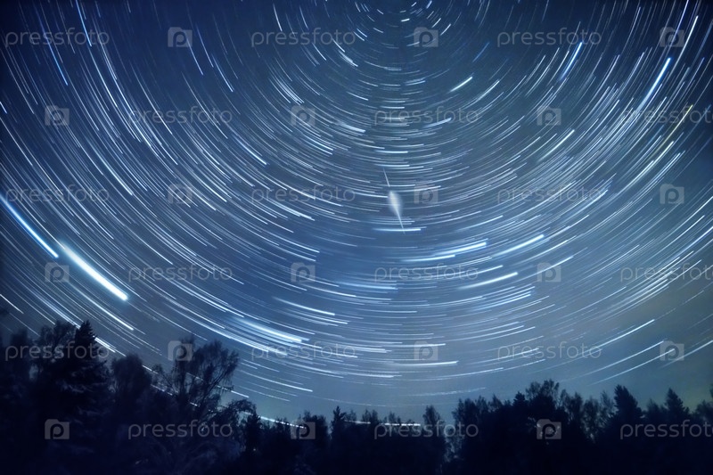 Звездное небо вращается вокруг полярной звезды. Оставляйте следы в виде линий. Зима, Россия