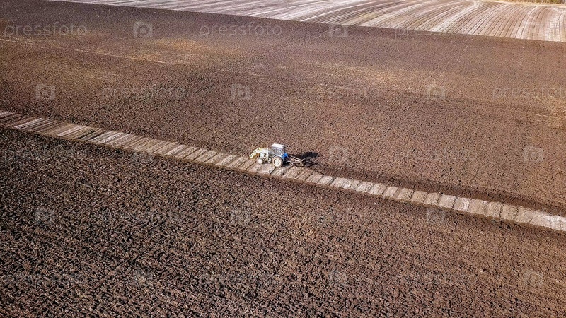 Трактор вспахивает поле с удобрениями. Осень, Россия