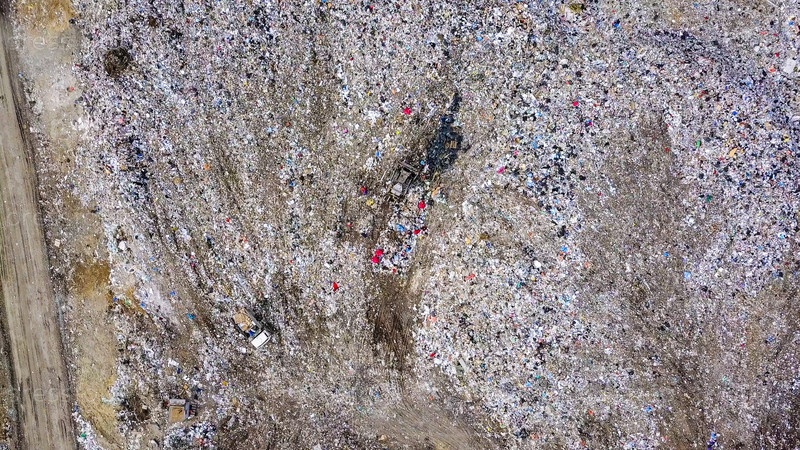 Трактор перевозит мусор на свалках в окрестностях города Екатеринбурга, Россия, с дрона, СНИМОК ГОЛОВЫ