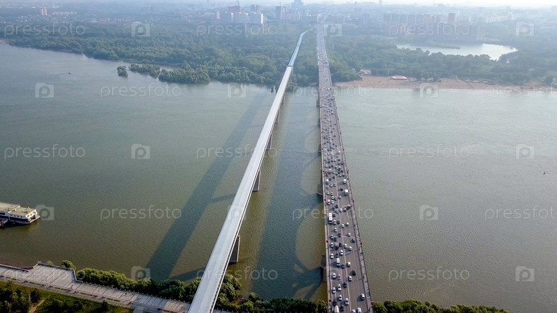 Метро-мост и Коммунальный мост. Панорама города Новосибирска. Вид на реку Обь. Россия, Из Дрона
