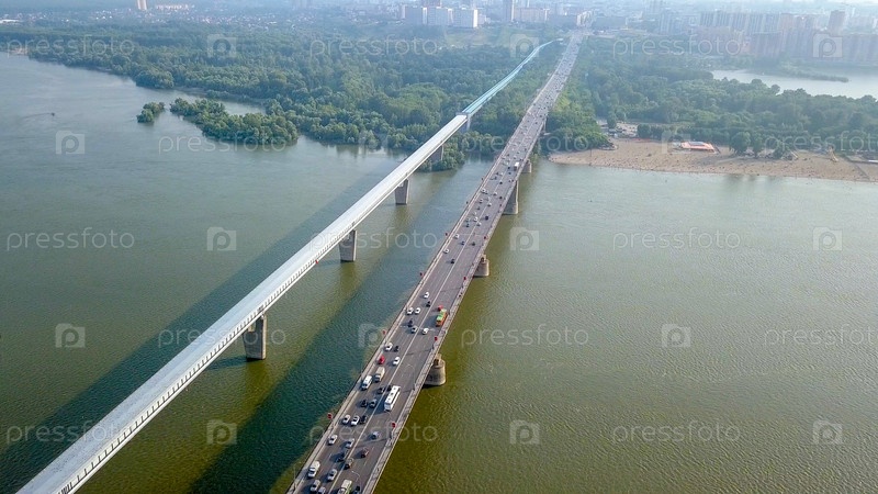 Метро-мост и Коммунальный мост. Панорама города Новосибирска. Вид на реку Обь. Россия, Из Дрона