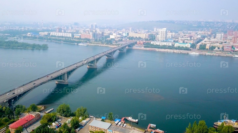 Вид на Коммунальный мост через реку Енисей. Центр города — Красноярск и Остров Отдыха. Россия, Из Дрона