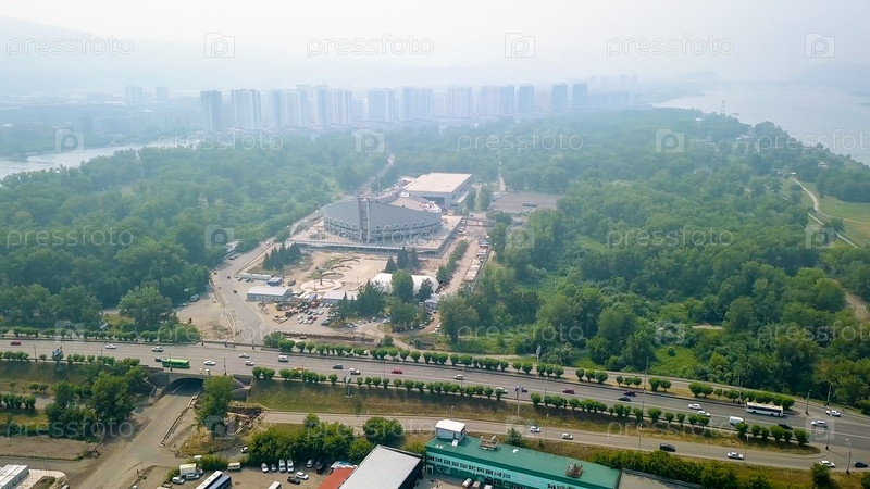 Вид на Коммунальный мост через реку Енисей. Центр города — Красноярск и Остров Отдыха. Россия, Из Дрона