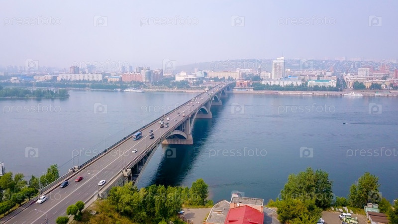 Вид на Коммунальный мост через реку Енисей. Центр города Красноярска. Россия, Из Дрона